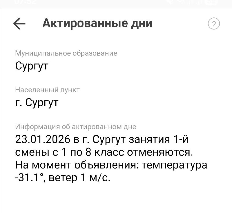 Между тем, согласно информации с официального приложения «Госуслуги. Моя Югра», на момент принятия решения в городе было -31 и ветер всего лишь 1 м/с. Согласно действующим нормам, такие погодные условия предполагают отмену очных занятий только для учащихся 1-8 классов.