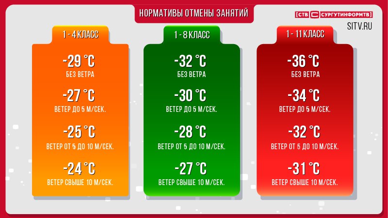 Напомню, по нормативам, установленным в Югре, занятия в безветренную погоду отменяются для младшеклассников, если температура воздуха находится на отметке -29, для учеников среднего звена: -32, а для выпускников: -36. Между тем, как ранее неоднократно объясняли журналистам СургутИнформ-ТВ в департаменте образования Югры, у каждого муниципалитета в округе есть право самостоятельно объявлять актированные дни, исходя из фактической погоды. Увидеть, какое решение в итоге приняли местные власти, можно будет на сайте sitv.ru, в специальном разделе «актировка», а также на телеканале С1.